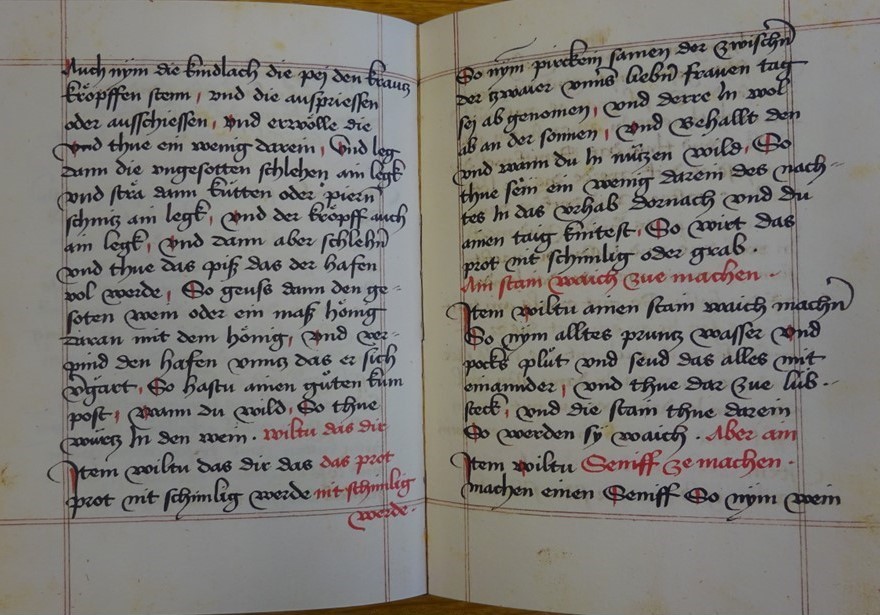 Die Überlieferung deutschsprachiger Kochrezepte beginnt im 14. Jahrhundert. Aus dieser Zeit ist uns nur sehr wenig überliefert und bei den wenigen Zeugen handelt es sich immer um Rezepte aus Sammelhandschriften. Das berühmteste Beispiel im deutschsprachigen Raum ist das sogenannte Buch von guter Speise von ungefähr 1350. Der Text ist gut untersucht und die Studien haben gezeigt, dass die Rezepte auch in jüngeren Handschriften überliefert sind. Diese stehen untereinander wiederum in einem Überlieferungszusammenhang. Es handelt sich also bei den meisten Rezeptsammlungen um Kompilationen, d.h. um Zusammenstellungen aus verschiedenen anderen Aufzeichnungen.
