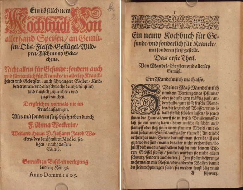 Titelblatt und erste Seite des Kochbuches der Anna Wecker, Basler Ausgabe von 1605